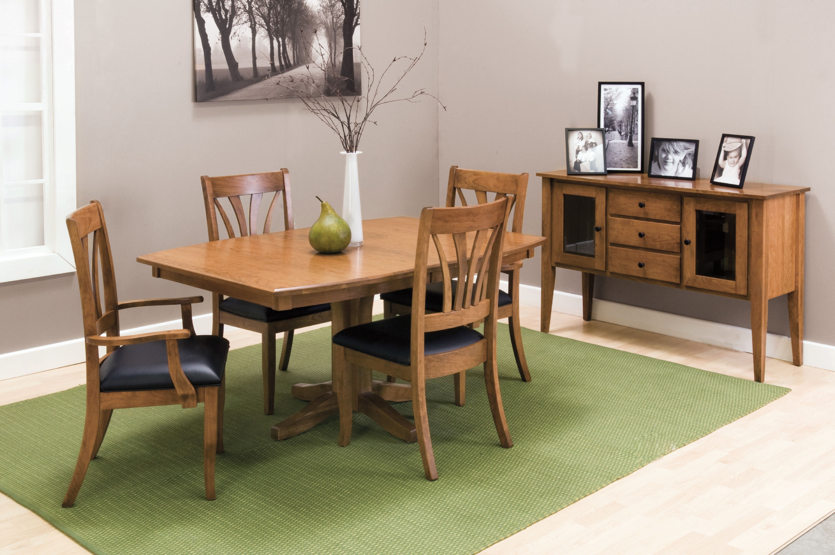 Environmentally friendly and beautiful to look at, this dining room set features a smooth plank style table top that is supported by a trestle style base. Ladder back Franklin chairs compliment the design. Crafted with pride, your customization options include the wood species of your choice along with stain and finish options and the fabric selection. This is truly a dining room set that you will enjoy for generations.